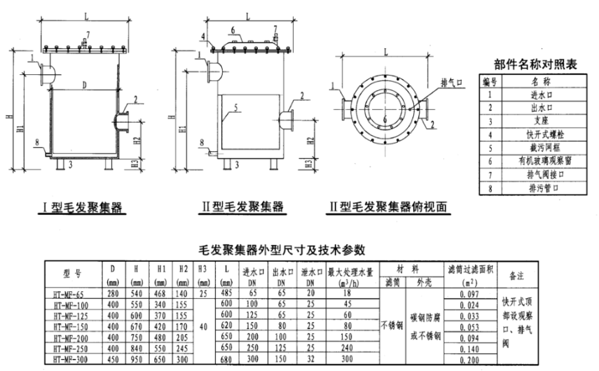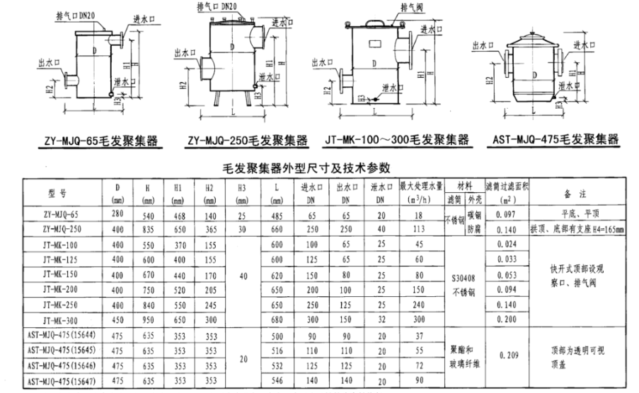 毛发聚集器材质:非金属材质为聚酯聚丙烯塑料。金属型材质为不锈钢、碳钢及铸铁。