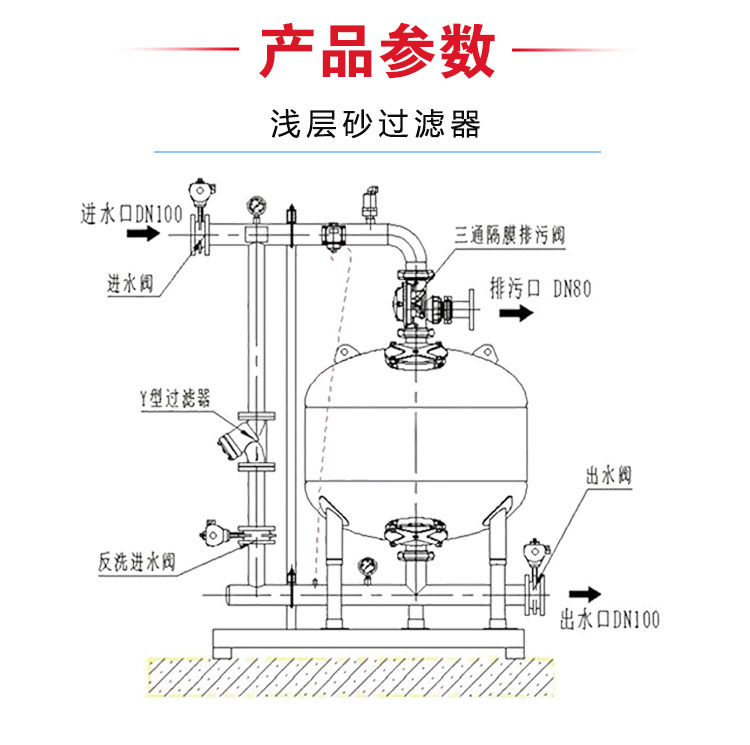 其他配件:过滤介质选用国产优质硅砂,砂颗粒尺寸为1~2毫米,均匀系数为1.2毫米;6档位多路控制阀;排水口;压力表;视察镜;布水均匀的布水装置;集水(反洗配水)均匀的集水装置;检修孔、进水管、出水管、泄水管、放水管、差压管、观察孔、取样管、流量计及各类切换阀; 必要时,还应设置空气反洗管、表面冲洗装置;冲洗排水管应设可观察冲洗排水清澈度的透明管段或其他装置。